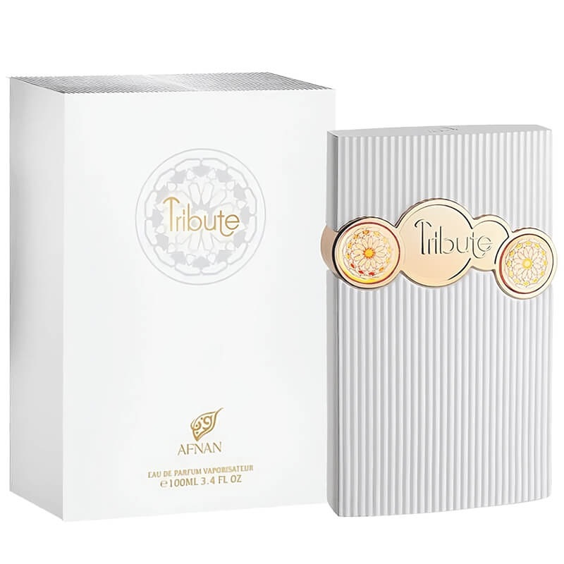 Afnan Tribute White 100ml EDP (L) SPTribute White by Afnan is a Floral Fruity Gourmand fragrance for women. Tribute White was launched in 2016. Top notes are Apple and Tangerine; middle notes are Jasmine and Neroli; base notes are Musk, Vanilla and Cedar.I