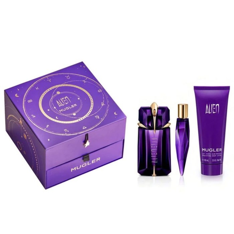 Set includes:- EDP spray 1.0 oz, Body Lotion 1.7 oz, EDP spray rechargeable 10 ml. Manufacturer Thierry Mugler Gender Women Perfume Type Eau De Parfum Sizes Standard
