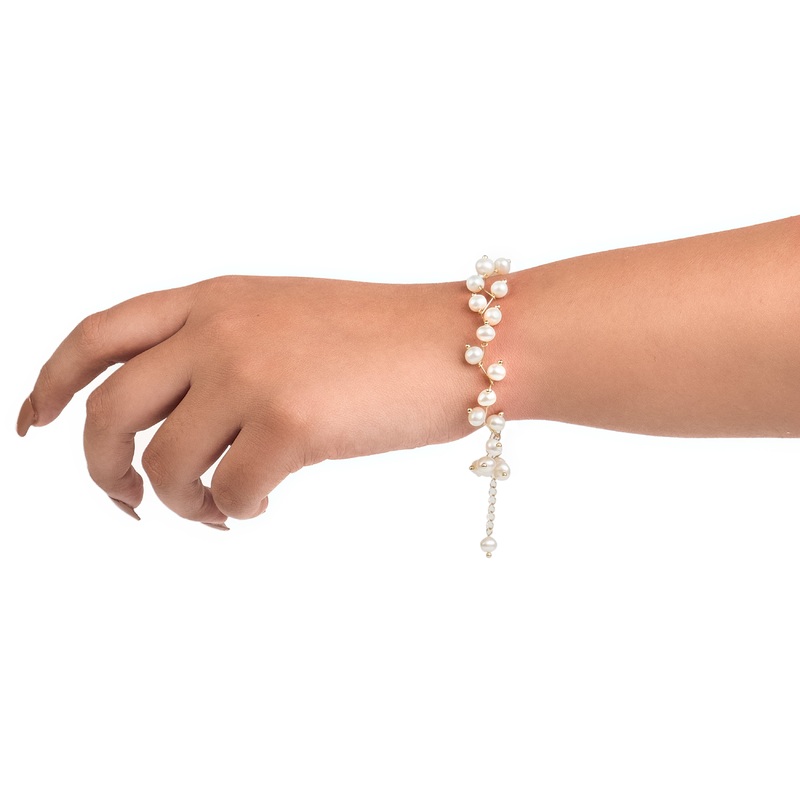 Introducing our branched bracelet, a true statement piece featuring its unique design and stunning white water pearls arranged beautifully. The branched design is crafted meticulously with delicate curves and branches to add a touch of natural beauty to the bracelet. The pearls are nicely positioned on the branches, creating a striking contrast against the golden hue of the bracelet. The pearls themselves are beautifully round and lustrous, with a pure and pristine appearance thats sure to turn heads. The bracelet is flowy and comes with a clasp for closure. This bracelets high-quality craftsmanship and elegance make it a true masterpiece that any jewelry lover would be proud to own.