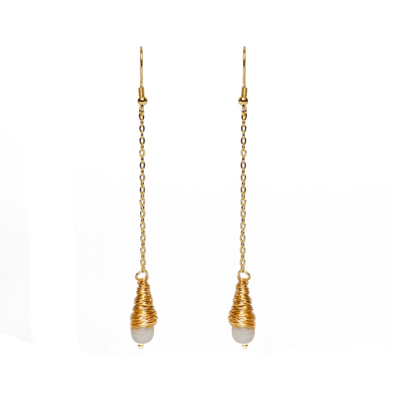 Introducing an exquisite piece of jewelry for your collection, featuring a long chain that extends down to a baroque pearl caged half in golden wire. The detailing is done intricately with delicate wire, giving it a striking appearance. And the pearl gives this pair of earrings a one-of-a-kind gesture.