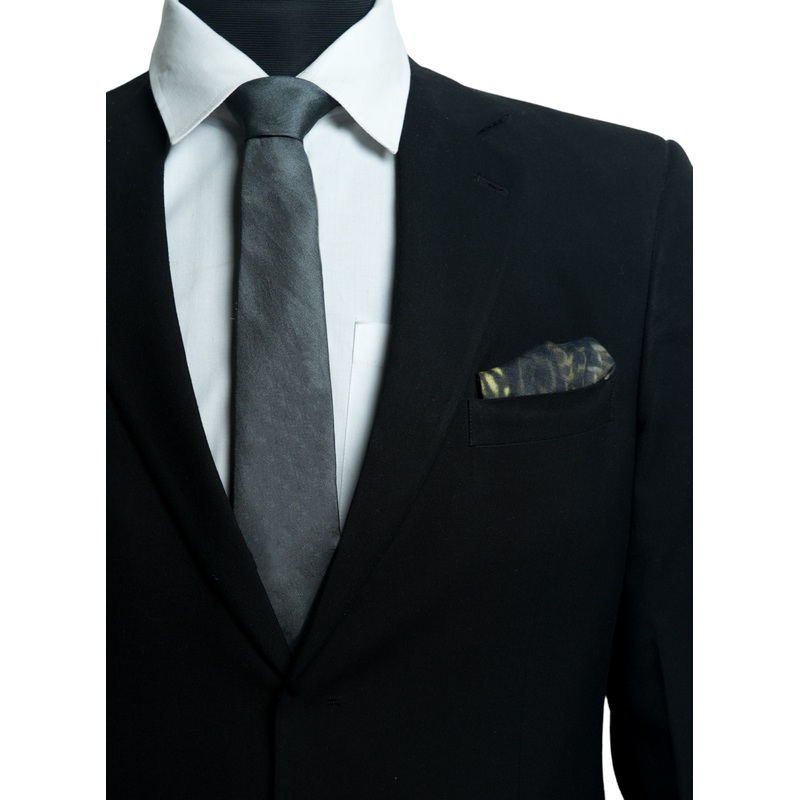 Package contains: "1 x Dark Gray Silk Necktie - Solids Range, 1 x The Eagle Has Landed Pocket Square"Material: "Necktie : 100% Pure Silk Pocket Square : 100% Linen"Dimensions: "Necktie : Length 157 cm, Width 7.6 cm Pocket Square : 18*18 inches "Care Instru