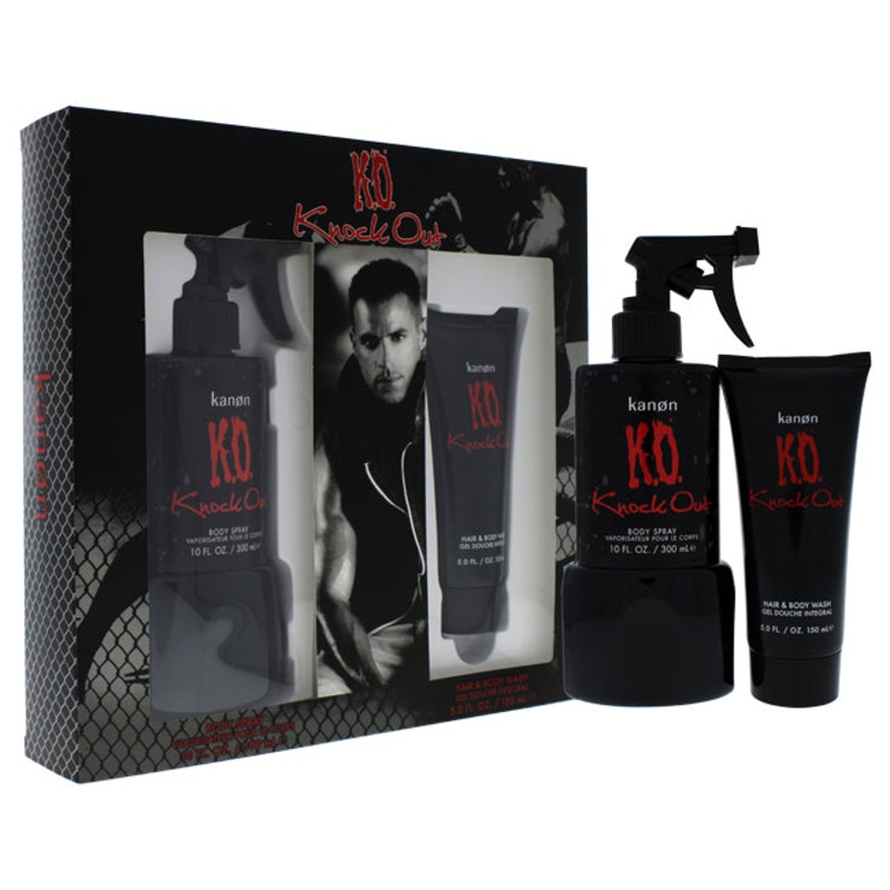 Launched by the design house of Kanon. This floral fragrance has a blend of citrusy notes of bergamot, lemon, cardamom, rosemary, fir, musk and oakmoss. K.O. Knock Out by Kanon for Men - 2 Pc Gift Set 10oz Body Spray, 5oz Hair and Body Wash