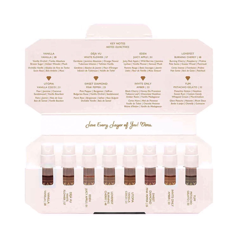 Kayali Vanilla | 28 Eau de Parfum 1.5ml Kayali Deja Vu White Flower | 57 Eau de Parfum 1.5ml Kayali Eden Juicy Apple | 01 Eau de Parfum 1.5ml Kayali Lovefest Burning Cherry | 48 Eau de Parfum 1.5ml Kayali Utopia Vanilla Coco | 21 Eau de Parfum 1.5ml Kayali Sweet Diamond Pink Pepper | 25 Eau de Parfum 1.5ml Kayali Invite Only Amber | 23 Eau de Parfum 1.5ml Kayali Yum Pistachio Gelato | 33 Eau de Parfum 1.5ml Create your own scent mood with this super-giftable and travel-friendly KAYALI Discovery Layering Set! From decadent gourmands to fruity florals, this limited edition set features eight of Mona’s fav fragrances and best-sellers in the collection. Wear them alone or layer together to discover your own signature scent combination. |