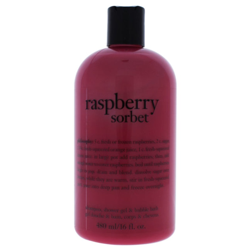 Luscious and delicious, philosophys raspberry sorbet shampoo, shower gel and bubble bath is packed with moisturizing agents that smooth and condition the skin and hair, while gentle cleansing agents remove excess oils and impurities.