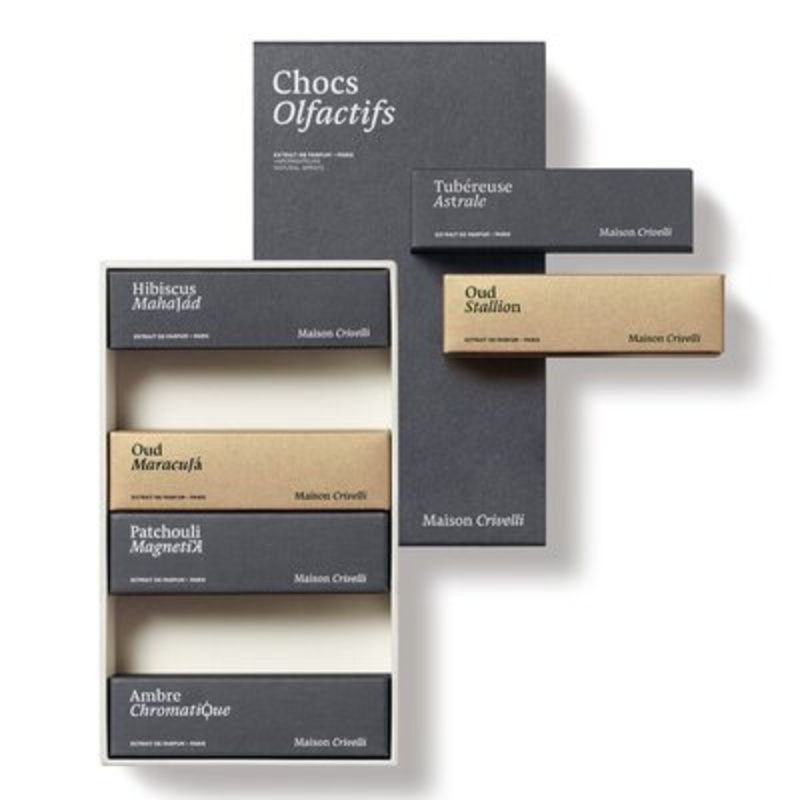 Maison Crivelli - Chocs OlfactifsThe six legendary fragrance extracts are now available in a set that includes the 5ml piccolo sizes of Tuberose Astrale, Hibiscus Mahajd, Patchouli Magnetik, Ambre Chromatique, Oud Maracuj and Oud Stallion.This size is idea