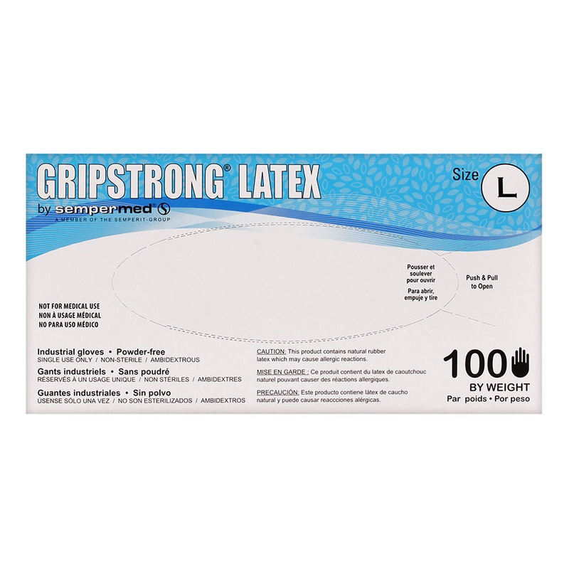 Sempermed Gripstrong Latex GlovesIndustrial glovesPowder-freeSingle Use OnlyNon-SterileAmbidextrousQuality system certified to ISO 9001WARNING: This product contains natural rubber latex which may cause allergic reactions.