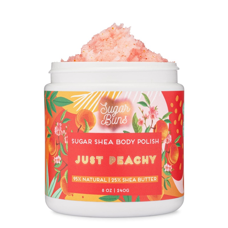 Buff and exfoliate your cute little peachy buns with delicious notes of juicy peaches, you'll have the smoothest peach around. Our Sugar Shea Body Polish is perfect to add to one's daily body care routine. Fine micro sugar exfoliates dead skin cells from t