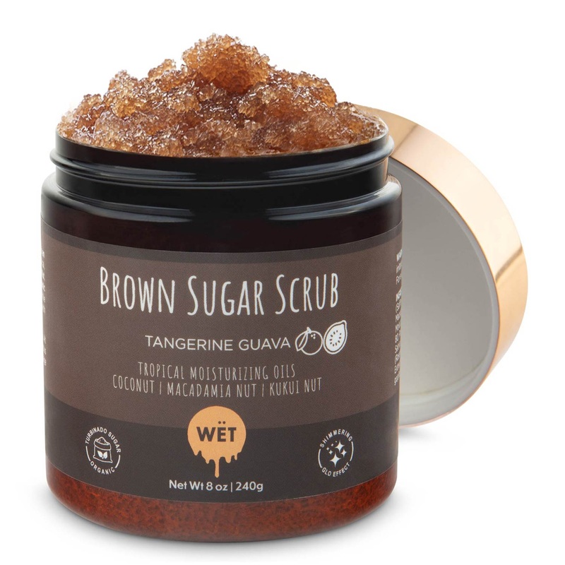 Our Tropical Glo Brown Sugar Shimmer Scrub is an all-in-one body treatment packed with tropical, skin-loving ingredients like Coconut, Macadamia Nut, Kukui Nut and Passion Fruit oils as well as organic turbinado sugar. Helps to exfoliate dry skin cells while moisturizing your skin, leaving it deliciously soft with a light gold shimmer.